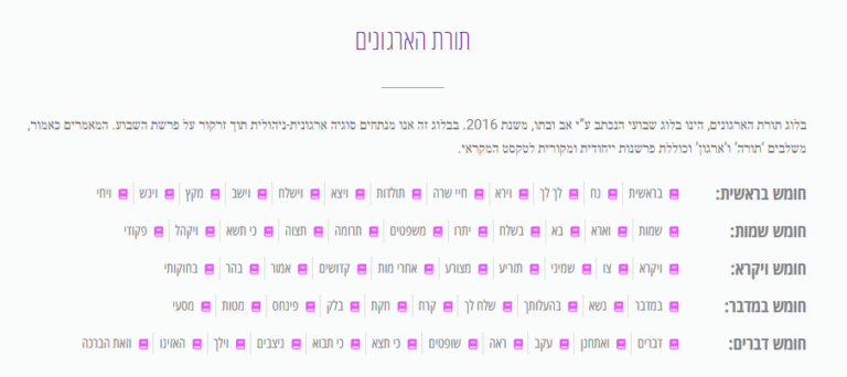 כל שבוע קיבלתי מאבי מאמר המבוסס על פסוק מהפרשה. לפרשנות זו חיברתי את ההקשר האירגוני – אתגרים שחוויתי ביום-יום במהלך העבודה השוטפת עם מגוון מנהלים וארגונים, תוך הקפדה על יצירת רצף וחיבור זורם בין שני החלקים.